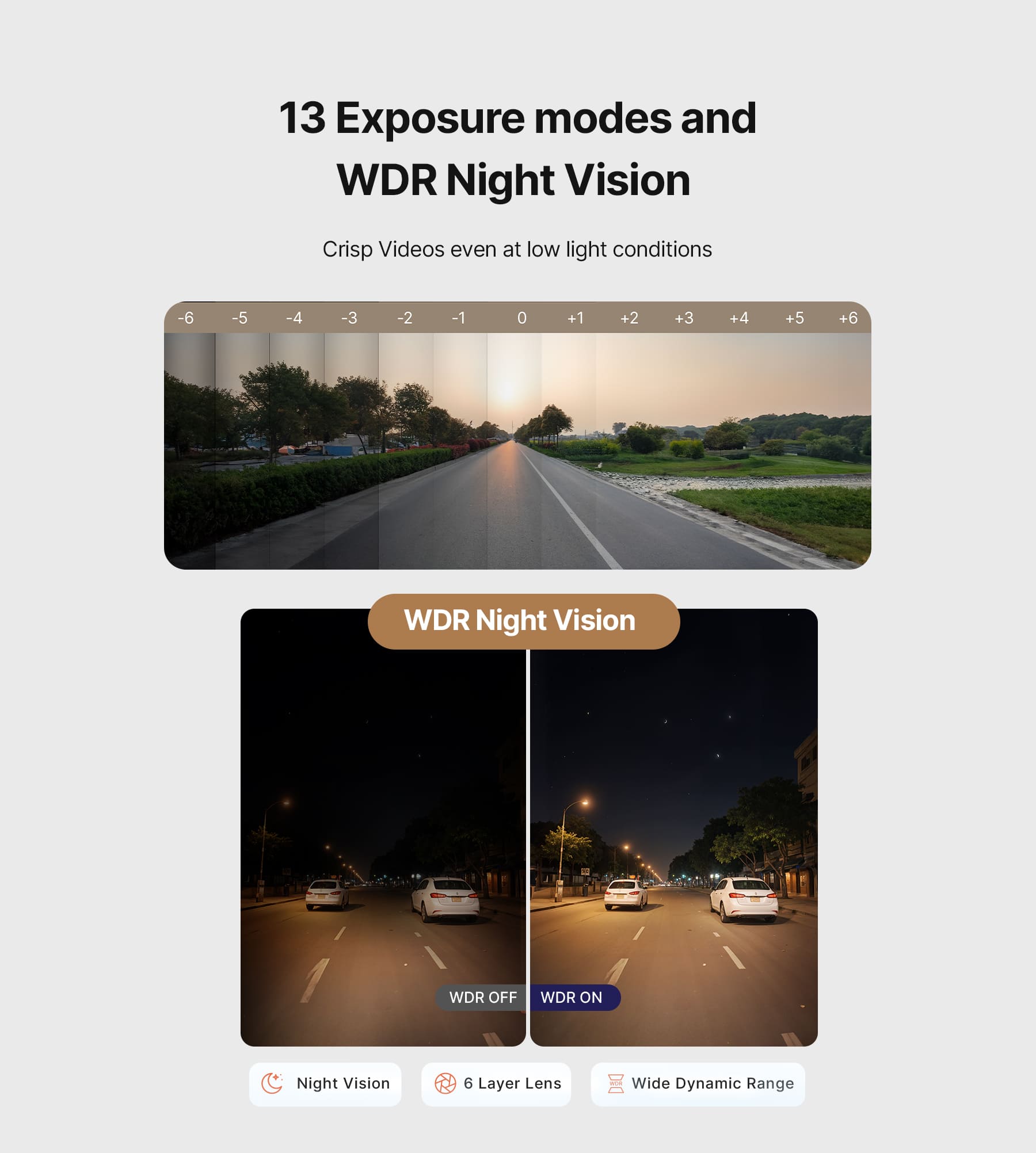 WDR Night Vision: Includes 13 exposure modes, night vision, 6-layer lens, and WDR