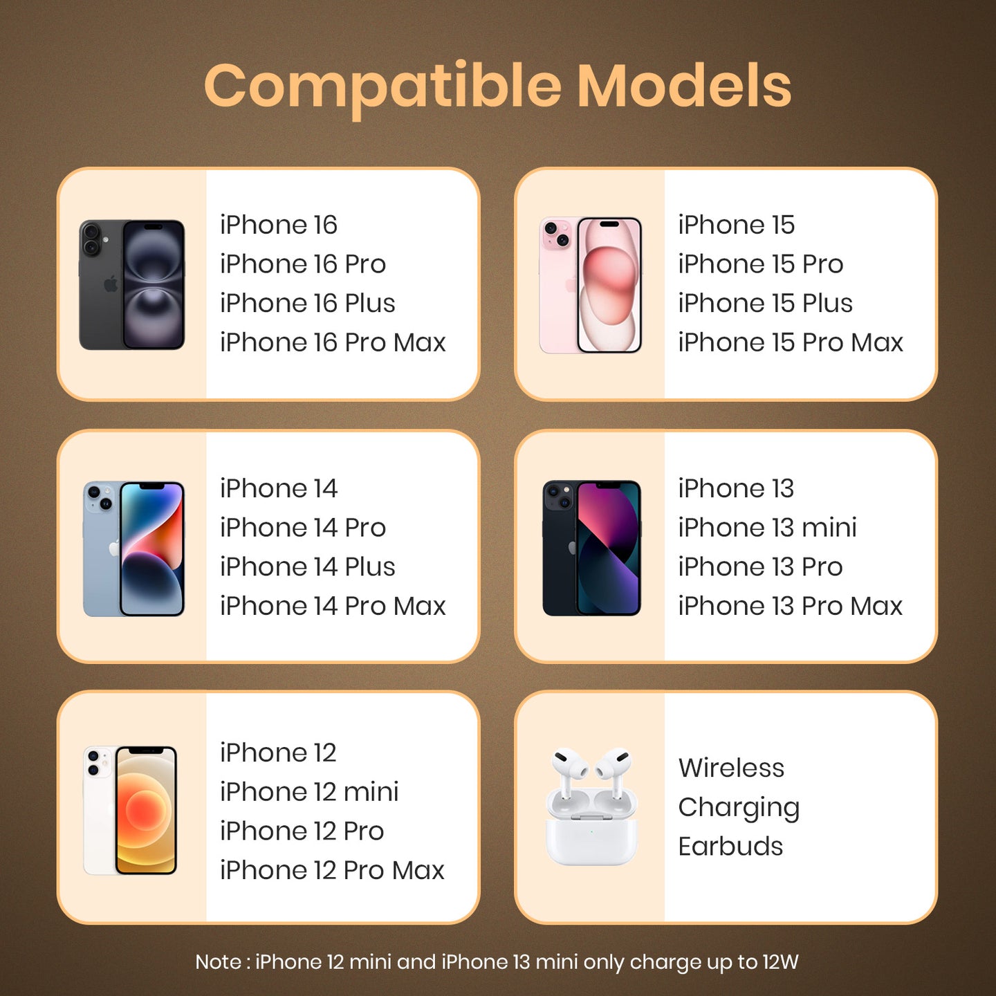 Fast 15W Wireless Charging: Ideal for iPhones (12 to 16 series) and Qi2-compatible devices.