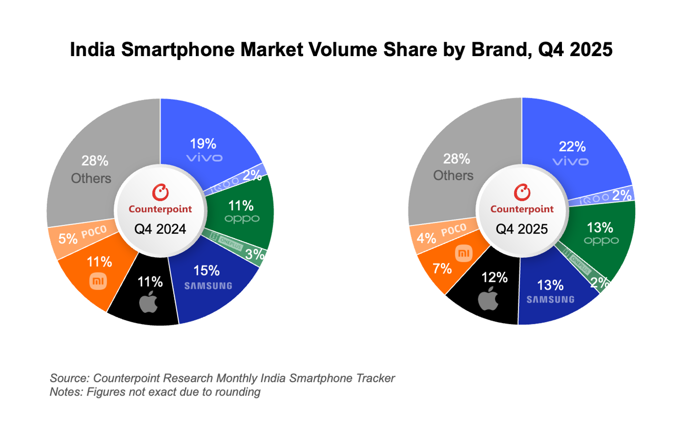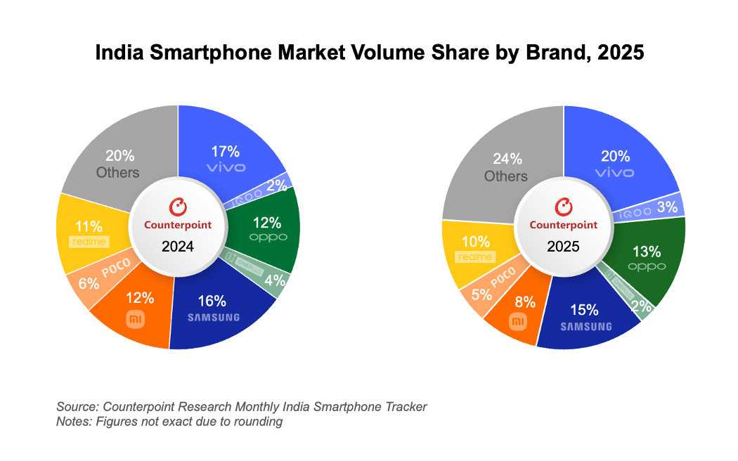Vivo (excluding iQOO) emerged as the market leader in 2025 with a 20% volume share. The brand adopted a dual strategy, driving volumes through the Y and T series while accelerating premium growth via the X series.