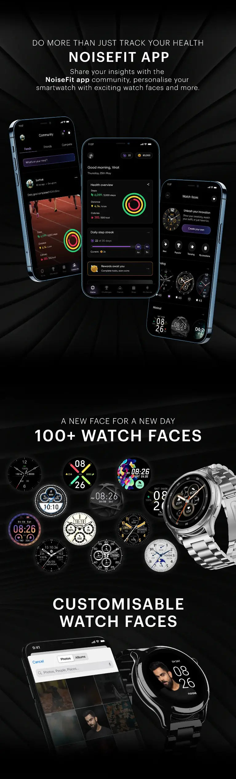 The NoiseFit Mettle is compatible with both Android and iOS platforms, providing flexibility for users across different ecosystems. To personalize the smartwatch, it offers over 100 customizable watch faces, allowing users to choose a design that suits their style and preferences.