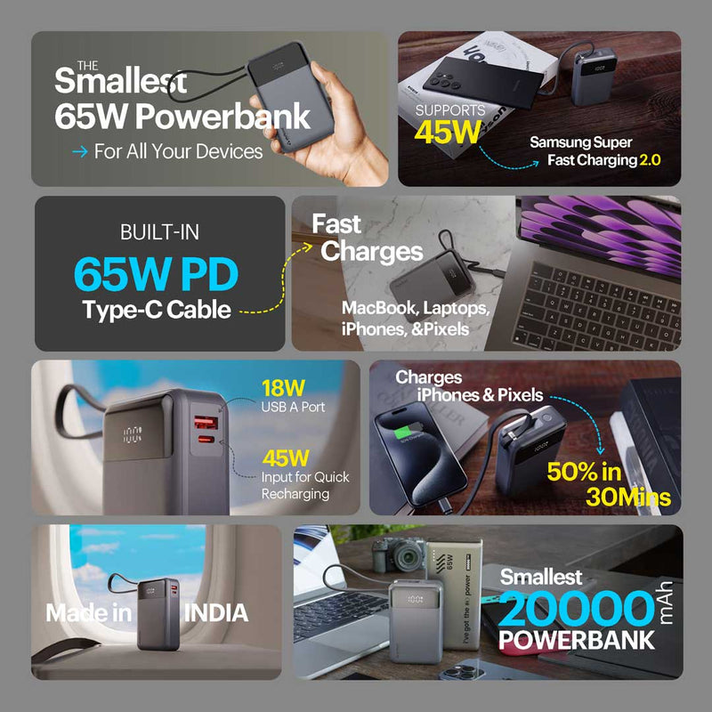 Stuffcool has unveiled the GIGA 65W 20000mAh Powerbank, an innovative addition to its power bank lineup. Promoted as the smallest 20,000mAh power solution with a built-in Type-C cable, this device is designed for users who need high-capacity, super-fast charging in a portable package. Packed with PD 65W output and PPS support, it is ideal for charging laptops, smartphones, and gaming consoles.