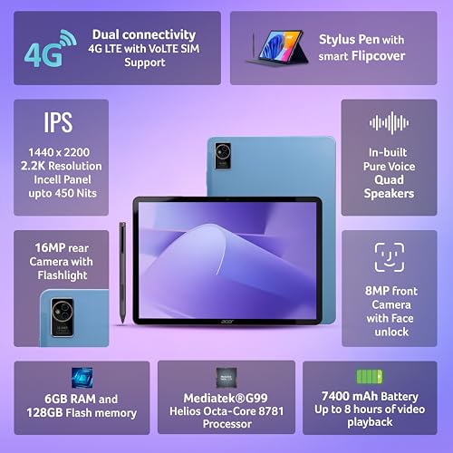 Specification: Acer Iconia Tab iM11-12M | 11.45” 60 Hz IPS Display, 450 nits, 6GB RAM + 128GB storage, 16MP Rear + 8MP Front Camera,Fingerprint Reader,Wi-Fi + 4G…