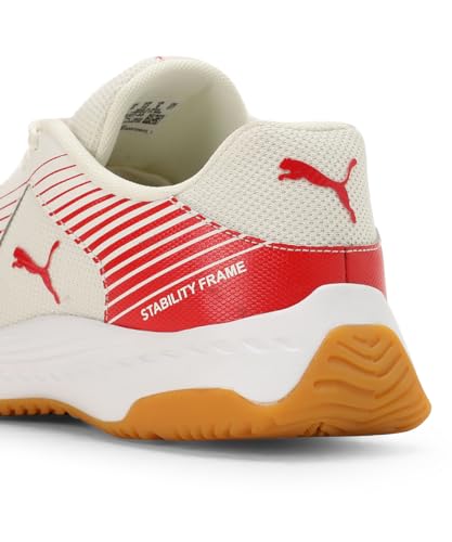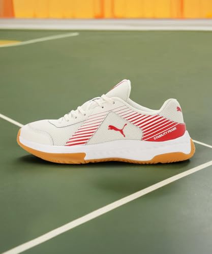 PRODUCT STORY: Ready for the smash? Experience the revolution of Variofoam, offering a lightweight cushion that propels you to leap and lunge with ease. The Variomesh upper envelopes your feet in unparalleled breathability and comfort, keeping you cool as the match heats up. Designed with a non-marking outsole for flawless movement and a stability frame that delivers exceptional lateral and medial support, these shoes are the ultimate ally in every intense rally. Details: Heel type: Flat Shoe width: Regular fit Shoe pronation: Neutral Heel-to-toe-drop: 0 mm Textile upper Non-marking rubber outsole. Suitable for use on indoor surfaces. Low boot Lace closure Variofoam for a lightweight cushioning sensation Variomesh provides superb breathability and comfort Stability frame for lateral and medial support PUMA cat logo branding