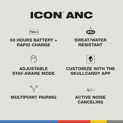 Specification: Skullcandy Icon ANC On-Ear Active Noise Cancelling Wireless Bluetooth Headphones, 60 Hr Battery, Microphone, Works with iPhone Android – Bone