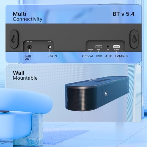 - MULTIPLE CONNECTIVITY: Supports Bluetooth v5.4, HDMI ARC, USB, Optical IN, and AUX, providing flexible options for connecting TVs, laptops, and media devices with ease.